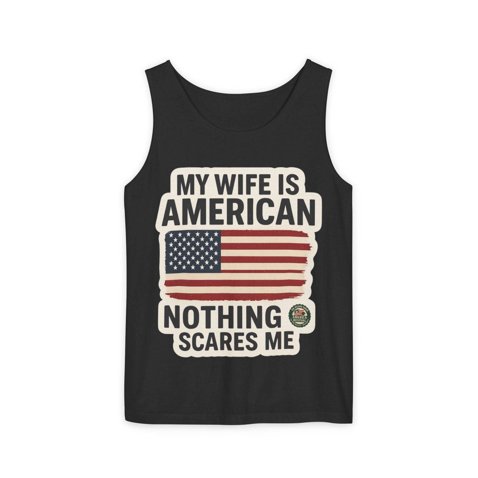 🔥 Stand proud and show your humor with this “My Wife Is American. Nothing Scares Me” tank top!